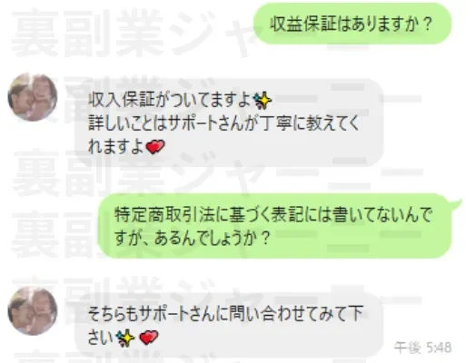 こちらも先ほどの収益保証と同じで質問した所、サポートに問い合わせてください。とのことでした。LINEで答えれば良いだけの話なのですがなぜ答えないのでしょうか?