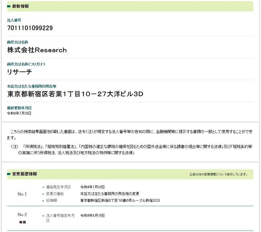 株式会社Research(リサーチ)は、2022年6月15日に法人番号指定された、設立して間もない会社でした。