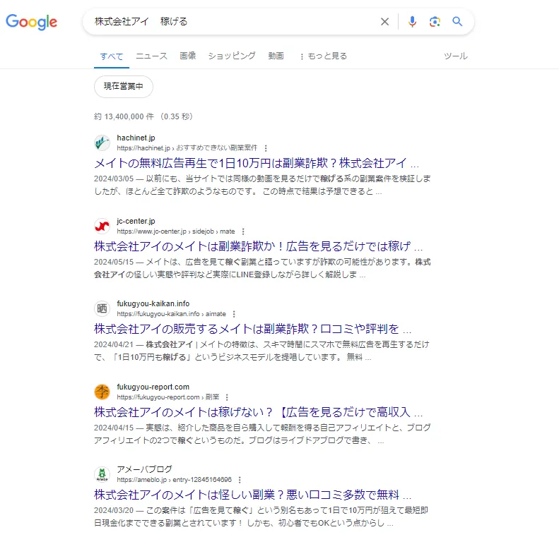 『株式会社アイ 副業』『株式会社アイ 稼げる』と調べたところ、喜びの声は一切なく逆に詐欺、稼げないなどの不審なワードばかりが並ぶ結果となりました。