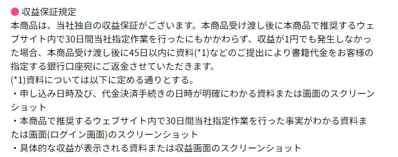 しかし、この実態は『収益が1円も発生しなかった場合』のみ保証されます。つまり、1円でも収益が出た場合は保証は一切されません。さらに、収益が発生した場合は、スターターセットの1,980円のみ保証対象になるため、高額で買ったマニュアルは対象外です。