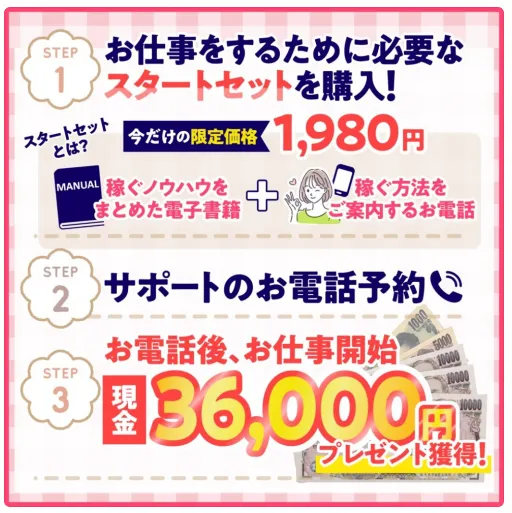 「【スタートセット】とはお仕事のノウハウをまとめた電子書籍【マニュアル】と 内容のご説明や、ご不明点を解決させていただくお電話【コールサポート】のセットになります!」とのこと。