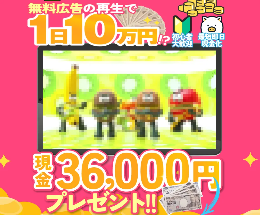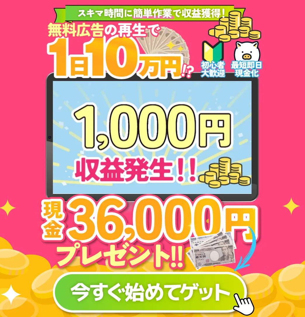 さらに、今なら3万6千円を全員にプレゼント中とのこと。即日10万円稼げばプレゼント中の金額も含めて13万6千円も稼げると大体的にアピールしています。動画を見るだけで稼げるとは夢のような話ですね。そんなことが可能なのでしょうか?