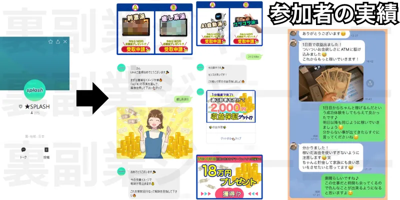 メッセージでは参加者の収益実績もLINEで送られてきます。しかし参加者は合同会社AkiyoshiやSPLASHなどのワードは話していません。自作自洗の可能性もあるため鵜呑みにしないようにしましょう。