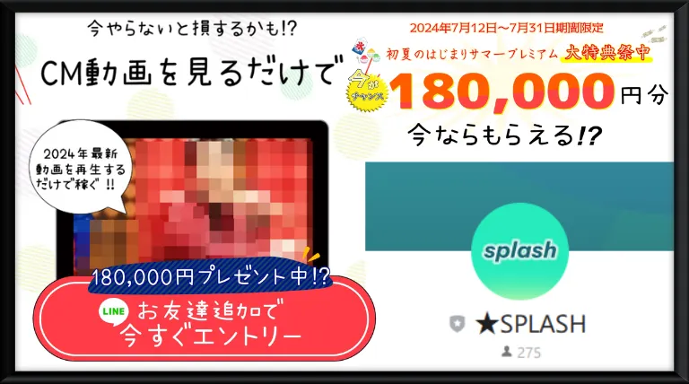 2024年最新動画を再生するだけで稼げる副業合同会社AkiyoshiのSPLASH(スプラッシュ)をご存じでしょうか?CM動画を見るだけでお金がもらえるなんて良いですよね、しかし世の中には甘い話ばかりではありませんでした。