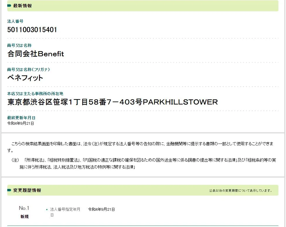 合同会社Benefitが、正式に設立登記をした会社法人なのか、国税庁の法人番号公表サイトを確認していきます。