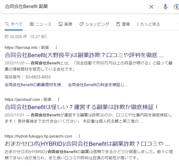 「合同会社Benefit 副業」というキーワードでGoogle検索してみました。