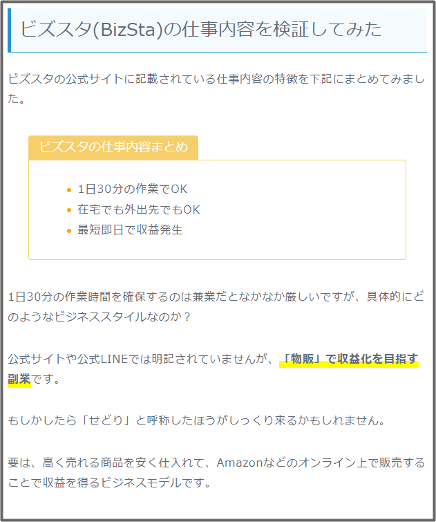 独自調査をしている最中、副業ジャパンという検証サイトで「ビズスタは物販」という情報をキャッチしました。