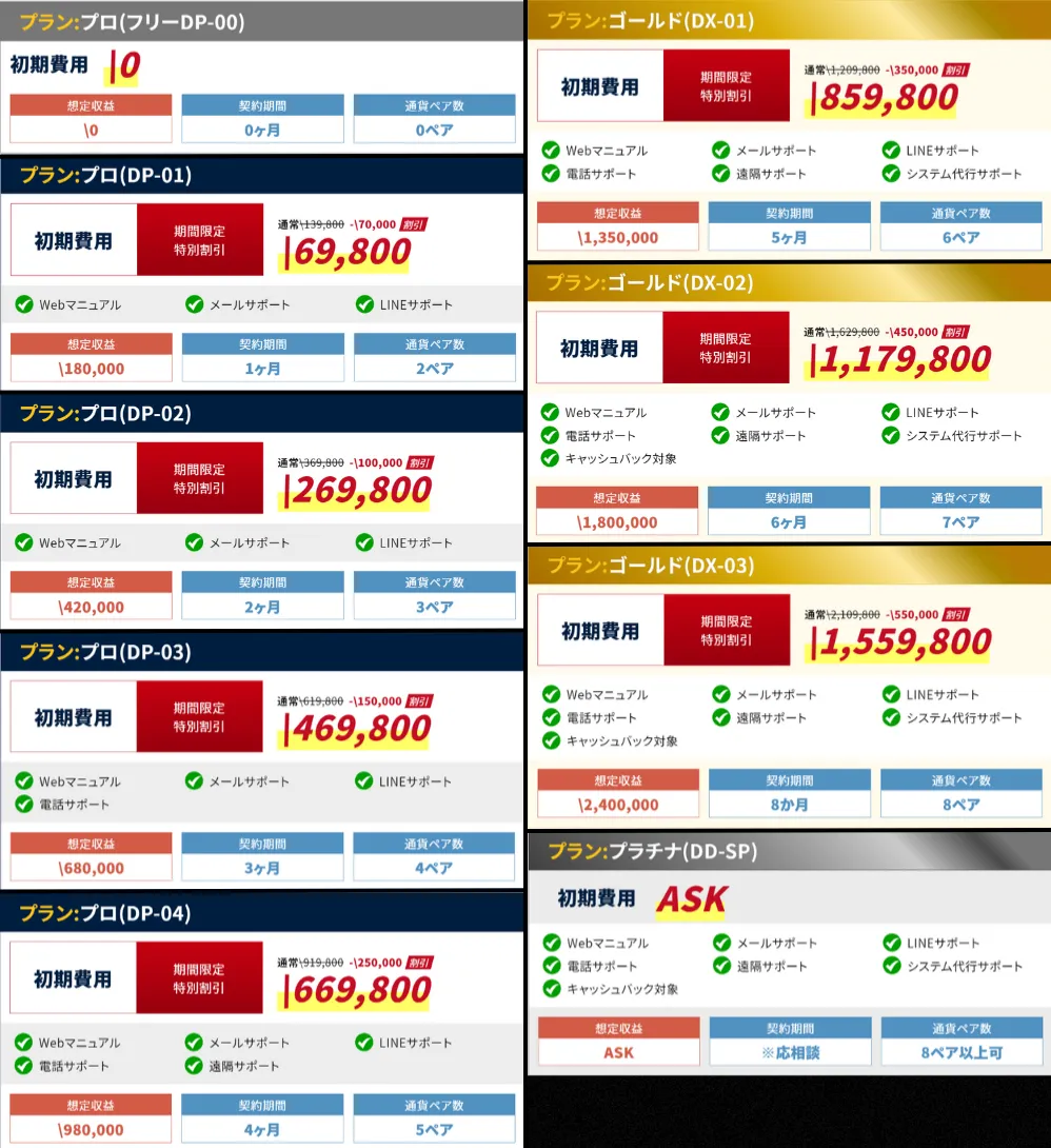 9つのプランに分けられており、価格は6万9,800円~155万9,800円以上と超高額です。