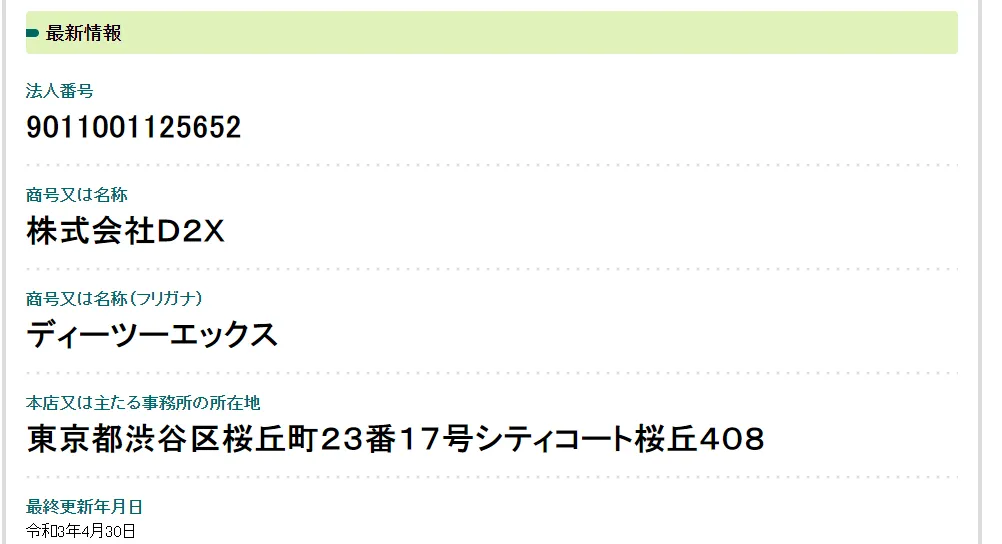法人登録はされているようです。法人に載っている住所は東京都渋谷区桜丘町23番17号シティコート桜丘408でした。所在地はシティコート桜丘408の部分はカットされていました。