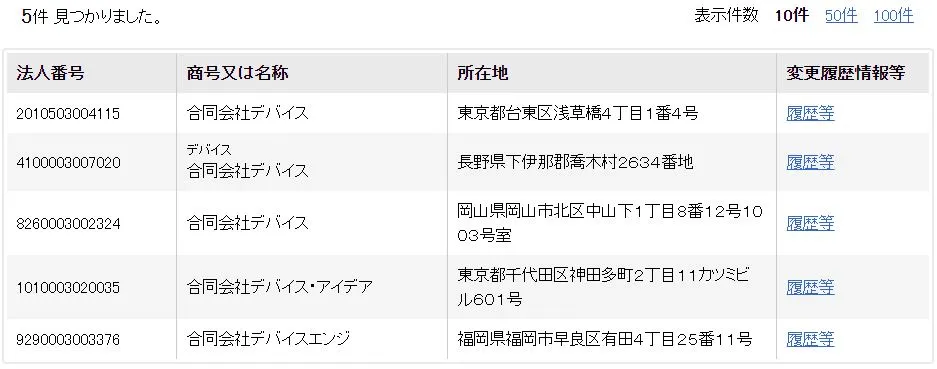 法人検索サイトで、「合同会社デバイス」で検索をしたところ、驚くべきことにこの会社の情報はヒットしませんでした。