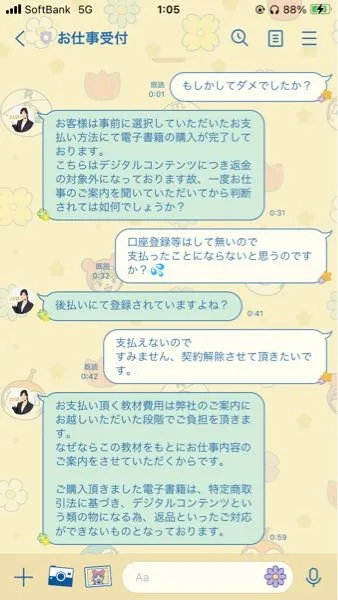 また、このLINEの前後のやり取りはわかりませんが、一度申し込みをしてしまうと支払い前にも関わらずキャンセルをするにもかなり体力を使いそうですよね。