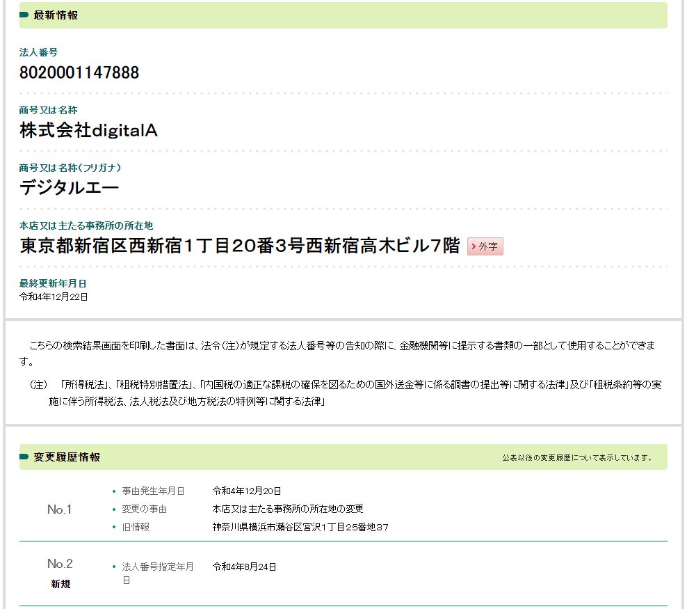 2022年8月24日に法人番号指定されたばかりの新しい会社であることが判明しました。