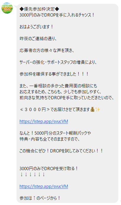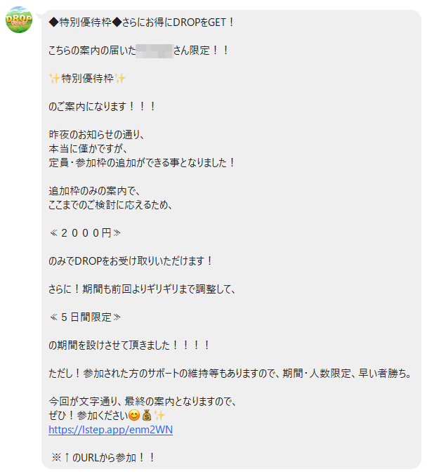 DROP(ドロップ)の公式LINE登録して5日後に募集を締切るという内容の案内が届きましたが、その翌日に「優先参加枠決定」という案内が届きました。