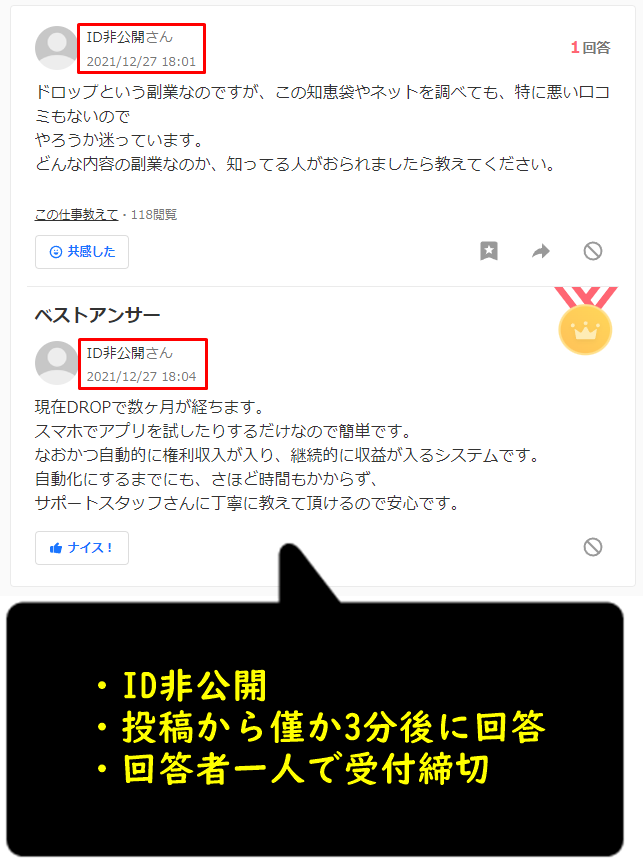 ヤフー知恵袋の投稿を鵜呑みにして「DROP(ドロップ)の副業は信頼できそう」と安易に判断するのは危険でしょう。