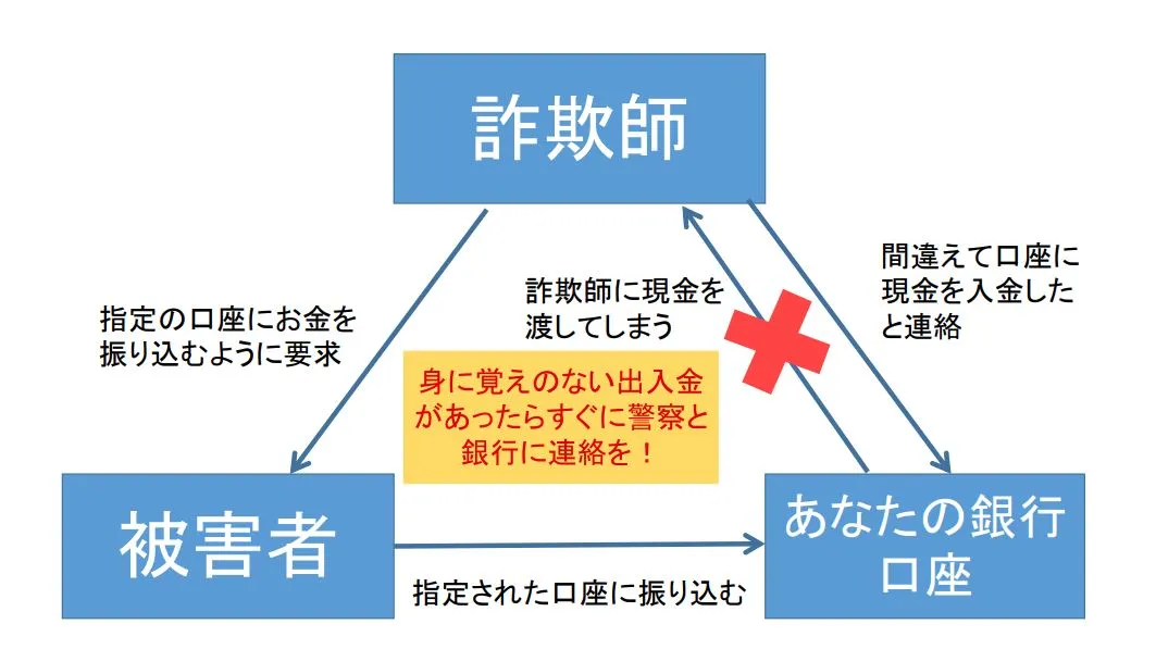 詐欺の手口としては様々ありますが、振込先として自身の口座が指定される場合、口座の持ち主が詐欺に関与しているとみなされます。