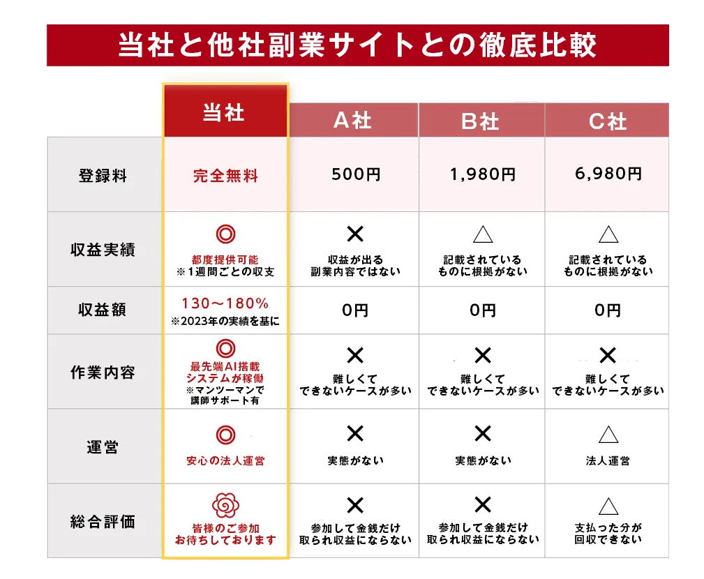 どこの誰が作成したか分からないような、評価基準も不明な表を鵜呑みにして株式会社FlowRace(田中旭)は安心だ!とルンルン気分になってはいけない。自己満足の表になっているため信用度はありません。