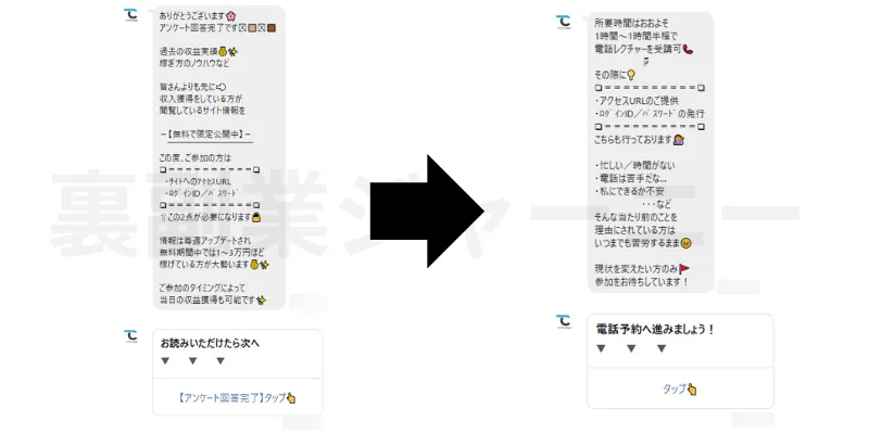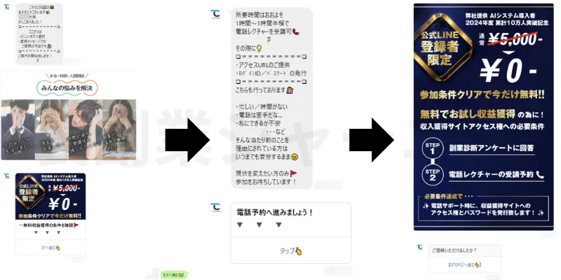 電話へ誘導し言葉巧みに高額プランやマニュアル購入をさせられます。怪しいと感じたら電話を切りましょう。
