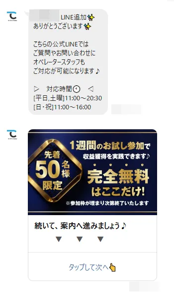 先着50名様限定と言うワードが目に飛び込んできました。完全無料は先着50名という突然のサプライズに驚きが隠せません。LPにも記載のない情報がLINEで次々と明かされていきます。