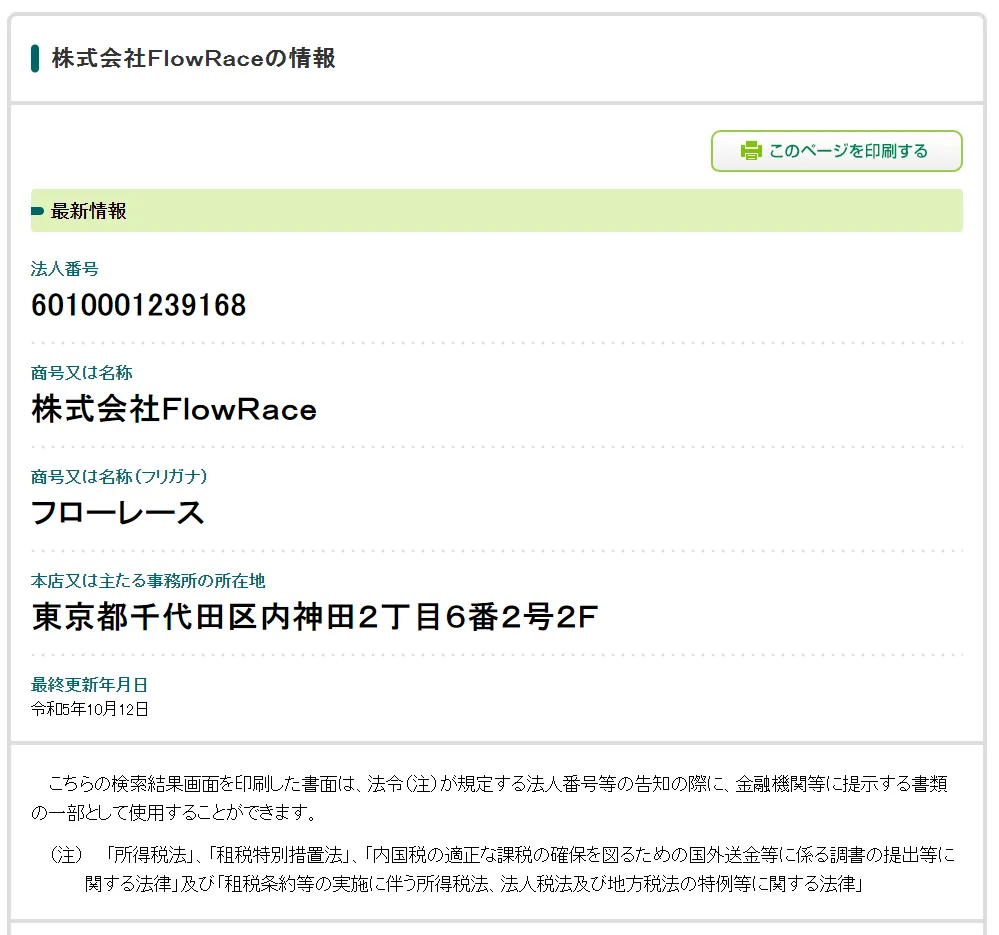 株式会社FlowRace(田中旭)にはホームページが存在しており確認してきましたが、会社概要や従業員数などの詳細はなく取引先も不明。信用できる要素は全く見当たらず、まるでハリボテのようでした。
