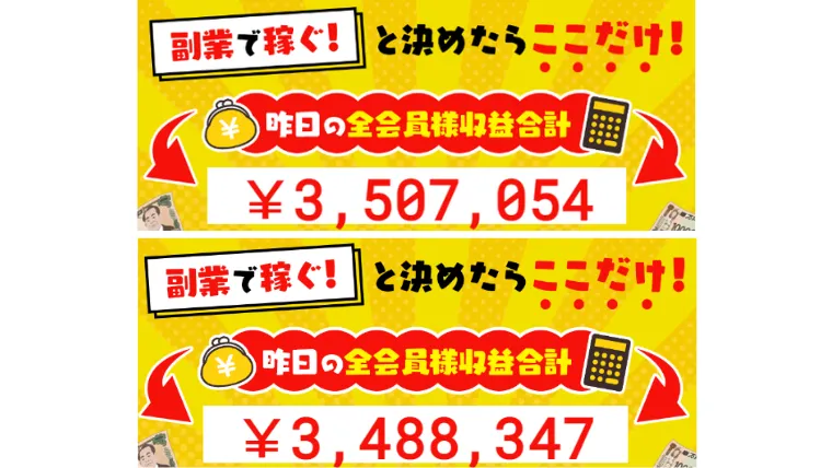 がっちりマネーの公式サイト上では「昨日の全会員様収益合計」として、約350万円の実績を公表してます。