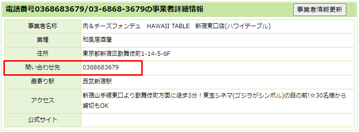 会社ホームページに記載の電話番号(03-6868-3679)を検索すると、チーズフォンデュのお店がヒットするのです。