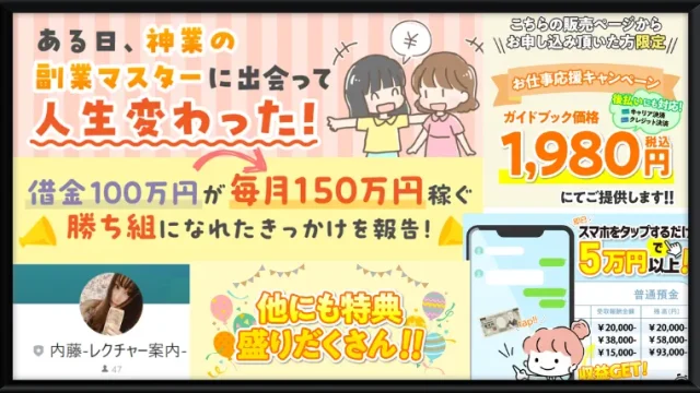 「0から副業月収5万円を突破!高単価Webライター無料勉強会」とサイトに記載があるためWebライターまたは副業を始めたい人は気になるのではないでしょうか?