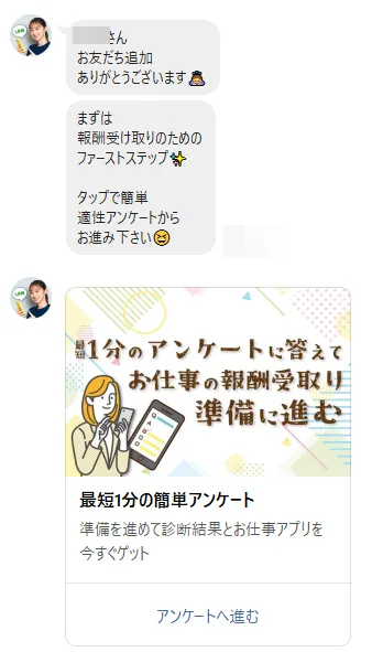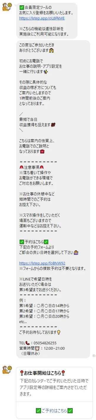 朝にメッセージを送ると夜まで返事が来ない状態が続きメッセージのやり取りは続かず電話の予約だけが催促されました。このような対応では副業を始めても満足いくサポートを受けられる気がしません。加えてメッセージもテンプレートのような返事でした。
