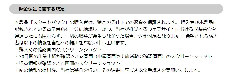 さらに、本製品「スタートパック」の購入者は、特定の条件下での返金を保証されます。と記載されていますが、こちらは大きな落とし穴です。本製品「スタートパック」の購入者ということは、スタートパック以外は対象にならないということです。高額なマニュアルを購入した場合は保証対象にはなりません。