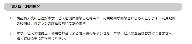 商品購入後と記載がありますが先ほどの『返金保証に関する規定』のように本製品「スタートパック」と記載しないのでしょうか。これは別の商品やプランを購入させるため濁した記載をしている可能性が高いです。利用期間の終期は、各プランの詳細と記載がある通りスタートパック以外にも料金別のプランがあることが明確になりました。