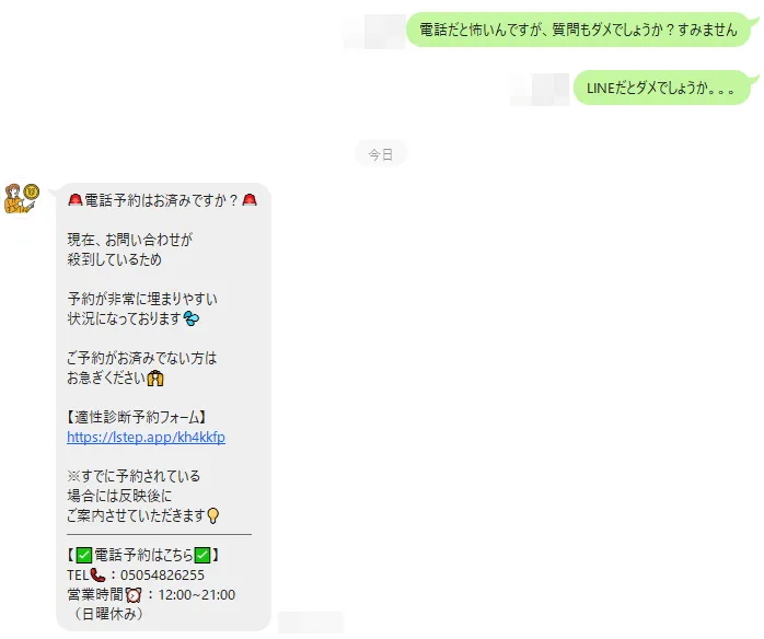 LINEでのやり取りはテンプレートの返事のみ、電話予約を要求されました。LINEでのメッセージスピードは遅く、おそらく電話もLINEメッセージも1人で行っているのか電話予約が入ってる時間帯は返答が一切ありませんでした。