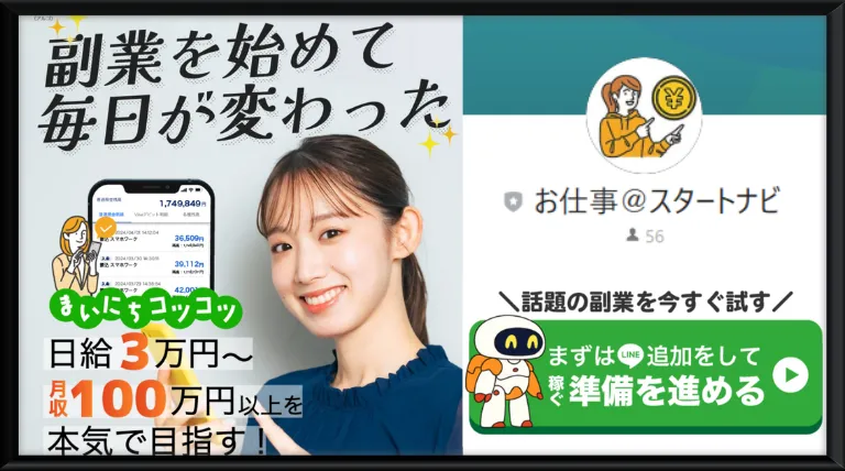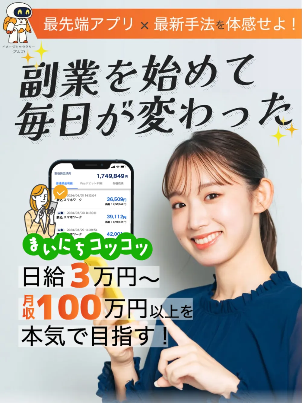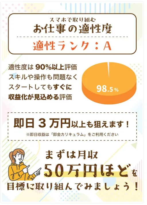LPにも記載があった通りスマホの基本操作、アプリのダウンロードが出来る方はAランクが付くと思われます。まずは月収50万円ほどを目標と結果に起票されていますが、あくまで目標であり稼げるとは記載されておりませんのでご注意ください。