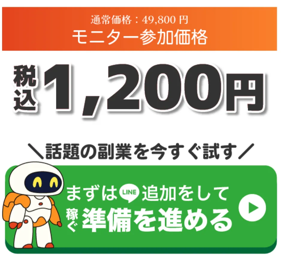今なら通常価格49,800円がモニター参加価格税込1,200円になるそうです。大変お得のように思えますが、こちらは何に支払う金額なのでしょうか?マニュアル代なのかサポート代なのか。仕事内容に加え説明が全くありません。まさか参加費用だけで割引しない場合は約5万円もするなんて事はないですよね?仮にマニュアルやサポートの代金とした場合、もう少し詳細に記載してほしいものです。