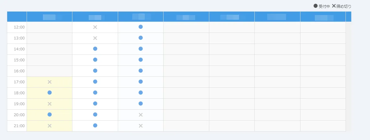 予約を入れた時間が●から×へと変わっていました。1名予約が入るとその時間帯は予約が出来なくなるようです。複数スタッフが常駐いるのではなく、電話は1人で対応しているようですね。しかしこんなに予定が空いているのに、LINEのメッセージであった「現在、お問い合わせが殺到しているため」は本当に殺到しているのでしょうか?予約はすべて空いているというのに(笑)
