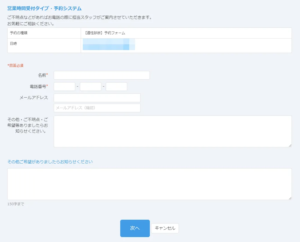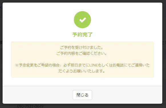 名前と電話番号のみ必須条件のようです。入力を終えるとスムーズに予約がとれました。