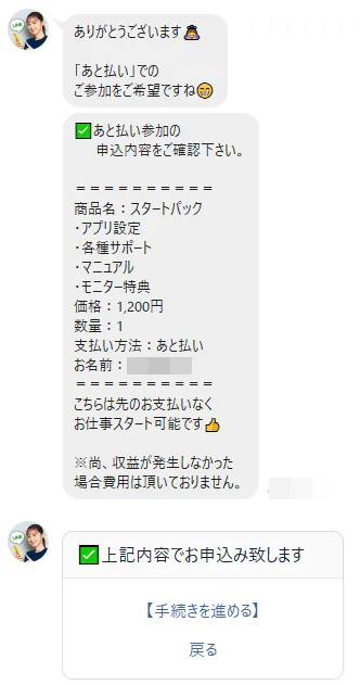 後払いを希望するとスタートパックについての説明が届きました。参加費用として支払う1,200円(割引無しの場合49,800円)はアプリの設定や各種サポートなどに使用されるようです。