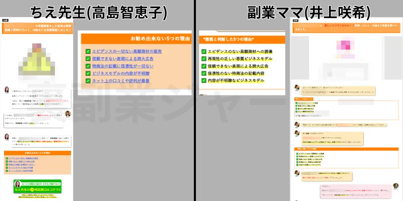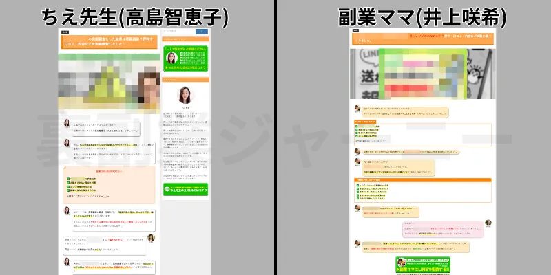 注意事項や吹き出しで説明する構成など酷似している点が多々あります。副業ママ(井上咲希)と同様ちえ先生(高島智恵子)もタイトルや記事内容は案件名を変更しただけの代わり映えしないBLOGでした。