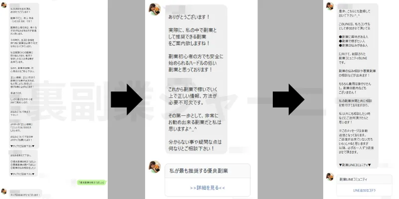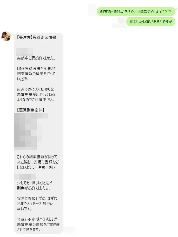 相談した結果、【要注意】悪質副業情報が送られてきました。私が知りたいのは悪質副業情報ではないため根気よく相談を持ち掛ける事にしました。