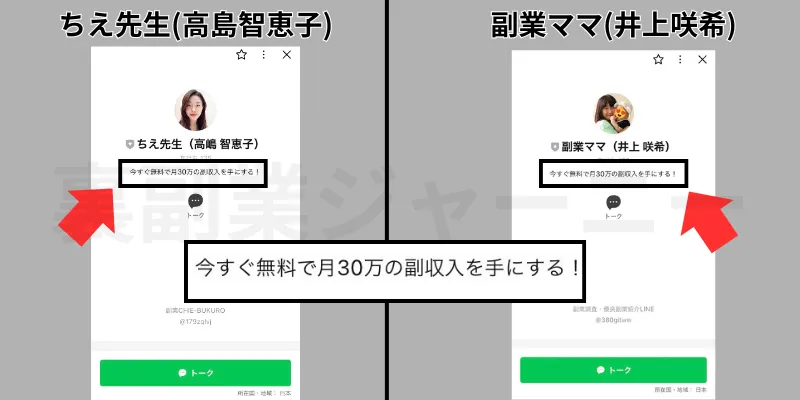 違いを見つける方が難しい間違い探しのような瓜二つのポップアップです。アイコンと色が違う程度でしょうか。余談ですが副業ママ(井上咲希)のポップアップは×を押しても消えないので少々鬱陶しかったです。