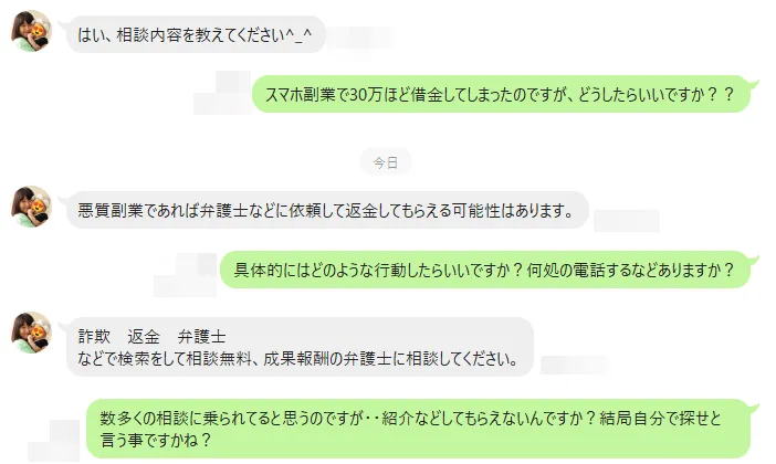 数日後やっと相談を聞いてくれましたが、インターネットで検索するよりも質の悪い返答でした。副業ママ(井上咲希)を信頼し相談した方が、このようなうっすい内容のメッセージを受け取ったらどう思うでしょうか?加えてこの後から返事はいただけませんでした。