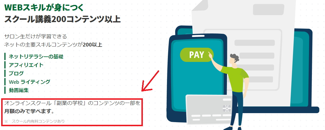 ただ、月額費用だけで全てのコンテンツが利用できるわけではなく、オンラインスクールのコンテンツの一部のみと書かれています。