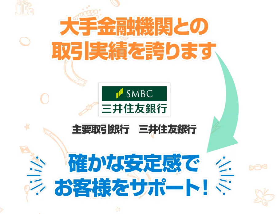 法人登録以外にも『大手金融機関との取引実績を誇ります』とも記載されており、CMなどでもお馴染みの大手銀行のロゴも大きく取り上げられている。誰でも聞いた事あるような有名な銀行と取引があるならと安堵するは待ってください。