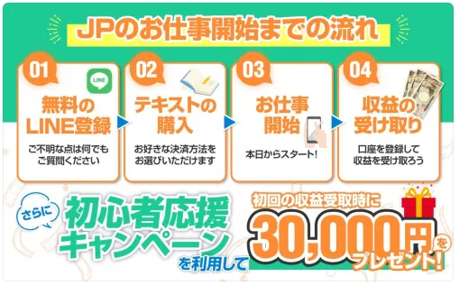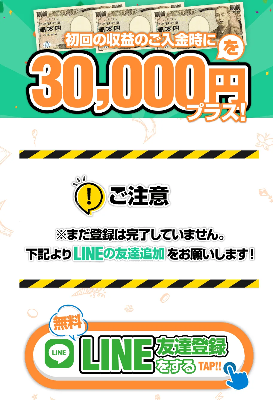 入力後はLINEの友達登録する必要があるようです。さらに目を引くのが30,000円プラスの文面がありました。副業を始めて収益と同時に3万円が入金されるとは、そのような事をして誰が得をするのか3万円に欲で目がくらむ前に一旦考えてみましょう。