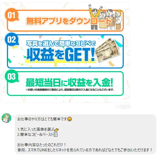 専用アプリを使用し自分の持っている写真を送り収益が獲得できるようです。SNSが普及している時代に自分の写真を見分けるのはどうするのでしょうか?LPの内容だけ確認するとSNSで勝手に画像を保存し送った場合も収益になるようですが、写真の目的も定かではないため簡単に手を出してはいけない雰囲気ですね。