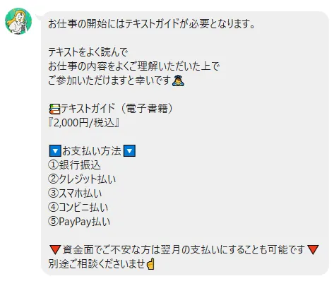 副業を紹介する前にテキストガイドの購入が必要のようですが、写真を送るだけコピーアンドペーストするだけのどこにテキストガイドを読む必要があるのでしょうか。他の作業がまた勝手に追加されているではないかと不安になりますね。