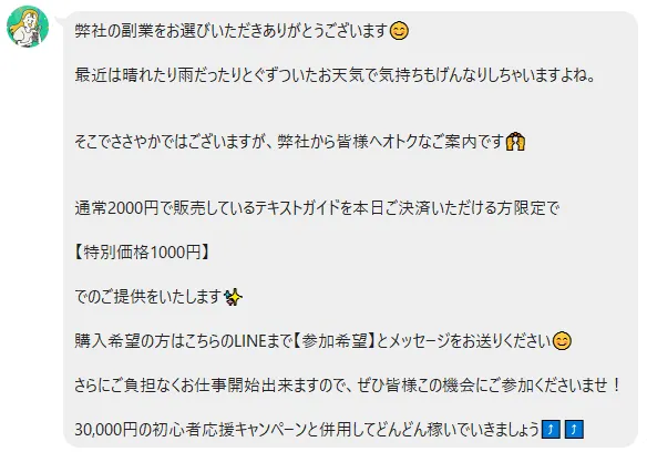 その後はテキストガイドを半額の値段まで値下げのメッセージがきました。さらに30,000円プレゼントの文面も。30,000もらえるなら1,000円くらい払おう!と気合が入りそうですが、これこそ罠なので警戒が必要です。