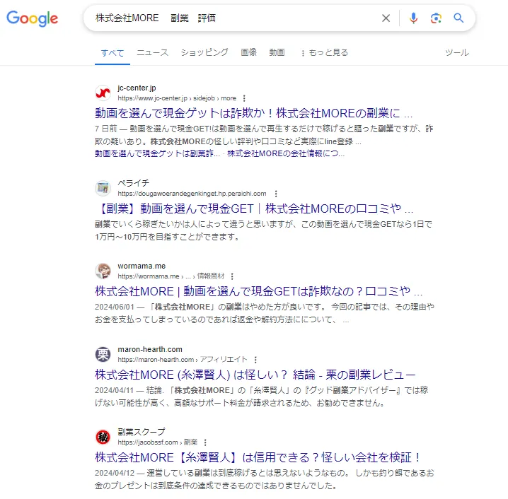 検索結果は怪しい、詐欺まがいと言った内容が並びました。その中には株式会社MOREの副業をオススメするサイトもありました。