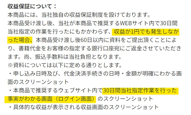 収益が1円でも発生しなかった場合とありますが1円でも収益があると保証対象から外れます。即日5万円も稼げると豪語しておきながら1円の収益もない場合とはケチすぎませんかね?