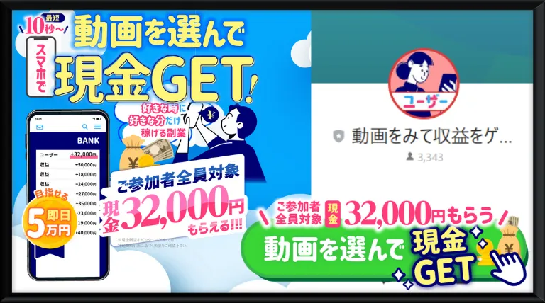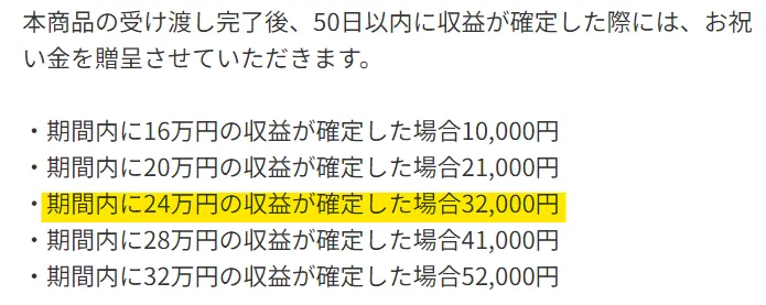 副業開始から50日以内に収益が24万円あった場合32,000円がプレゼントされる仕組みになっています。動画1再生の値段が明確ではない内は登録を控えましょう。