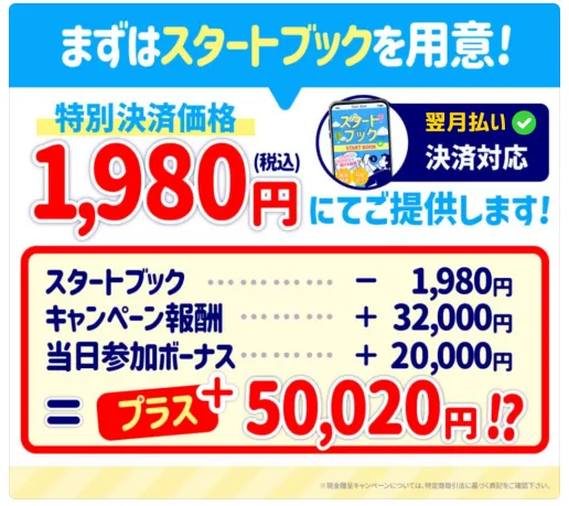 32,000円もらえるならスタートブック(1,980円)を払ってもプラスになる!と意気揚々と申し込みたい所ですが、こちらもしっかりと確認してください。ただより高いものはありません。