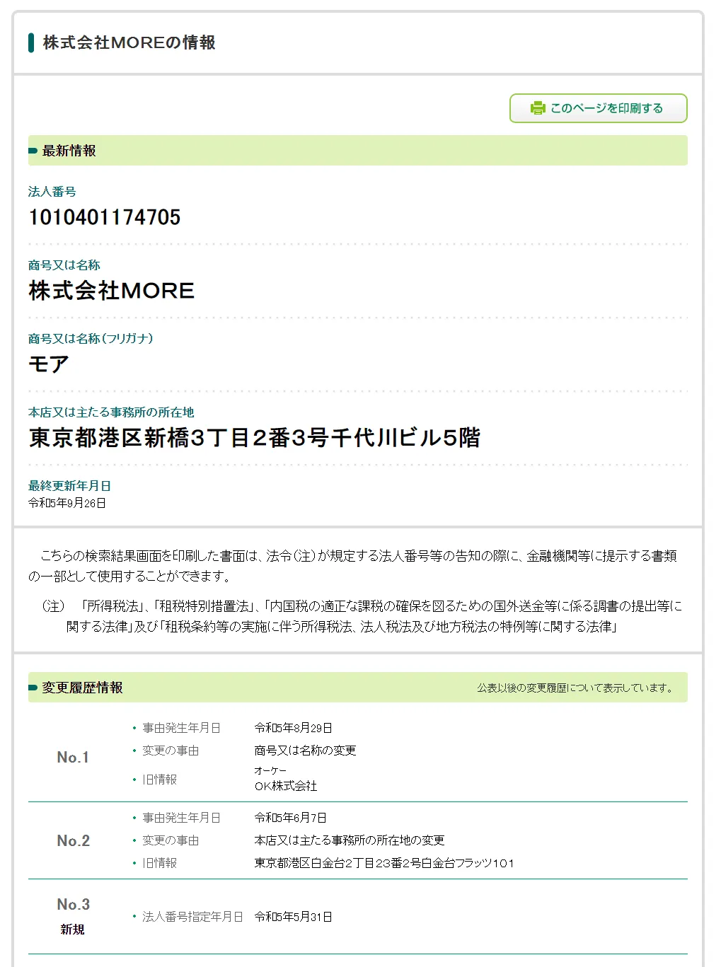 株式会社MOREの前にOK株式会社という会社名を使用していた事が記載されています。